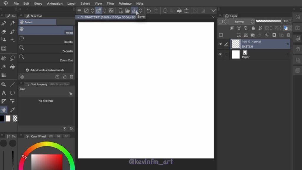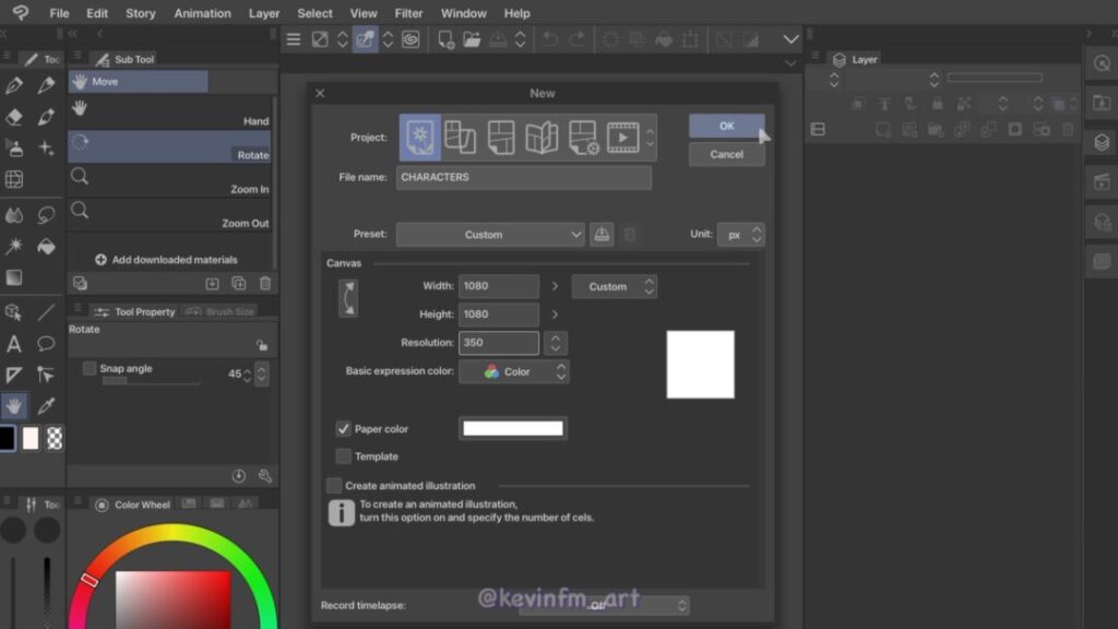 Abrimos Clip Studio y vamos al menú: Archivo – Nuevo. Y elegimos la primera opción, la opción de Ilustración, con las siguientes medidas: 1080×1080 px, 350 ppp.